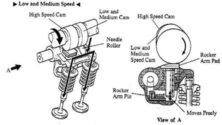 在可變氣門正時方面HONDA發(fā)動機具有一定得領(lǐng)先性他的發(fā)動機在低負荷運轉(zhuǎn)情況下,小活塞在原位置上,三根搖臂分離,主凸輪和次凸輪分別推動主搖臂和次搖臂,控制兩個進氣門的開閉,氣門升量較少,其情形好像普通的發(fā)動機。雖然中間凸輪也推動中間搖臂,但由于搖臂之間已分離,其它兩根搖臂不受它的控制,所以不會影響氣門的開閉狀態(tài)。但當(dāng)發(fā)動機達到某一個設(shè)定的高轉(zhuǎn)速(例如3500轉(zhuǎn)/分時,本田S2000型跑車要達到5500轉(zhuǎn)/分),電腦即會指令電磁閥啟動液壓系統(tǒng),推動搖臂內(nèi)的小活塞,使三根搖臂鎖成一體,一起由中間凸輪驅(qū)動,由于中間凸輪比其它凸輪都高,升程大,所以進氣門開啟時間延長,升程也增大了。當(dāng)發(fā)動機轉(zhuǎn)速降低到某一個設(shè)定的低轉(zhuǎn)速時,搖臂內(nèi)的液壓也隨之降低,活塞在回位彈簧作用下退回原位,三根搖臂分開。這樣一來就保證了您在低轉(zhuǎn)速時對油耗的控制,同時滿足你在發(fā)動機處于高轉(zhuǎn)速下澎湃動力輸出的需要。整個VTEC系統(tǒng)由發(fā)動機主電腦(ECU)控制,ECU接收發(fā)動機傳感器(包括轉(zhuǎn)速、進氣壓力、車速、水溫等)的參數(shù)并進行處理,輸出相應(yīng)的控制信號,通過電磁閥調(diào)節(jié)搖臂活塞液壓系統(tǒng),從而使發(fā)動機在不同的轉(zhuǎn)速下由不同的凸輪控制,影響進氣門的開度和時間。從而產(chǎn)生出您最希望獲取的動力輸出。