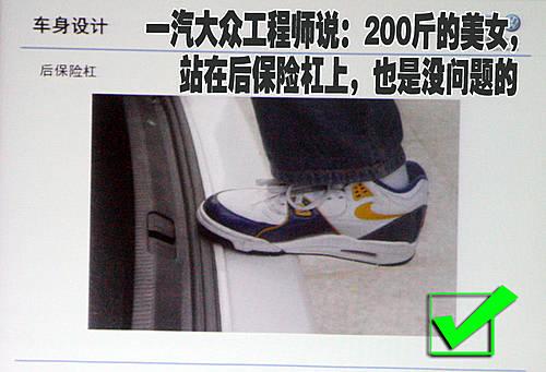 一汽大眾產(chǎn)品部工程師這樣說:“即便一個(gè)200斤美女站在我們產(chǎn)品的的后保險(xiǎn)杠上,那也是沒有問題的”。雖然我們身邊很少有人去嘗試站在保險(xiǎn)杠上,但是這樣的設(shè)計(jì)都源自大眾的嚴(yán)謹(jǐn)態(tài)度,在很多時(shí)候您的愛車完全可以當(dāng)作一架小梯子去使用。
