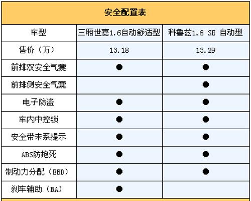 從上面表中我們看出,科魯茲在被動(dòng)安全配備上更出色,除了正面雙氣囊外還配備了側(cè)面安全氣囊,當(dāng)車(chē)輛發(fā)生側(cè)面碰撞時(shí)對(duì)駕乘者的保護(hù)要更到位。相比之下三廂世嘉只在更高的豪華型中配備了側(cè)氣囊,不過(guò)三廂世嘉的主動(dòng)安全方面卻比較完備,ABS+EBD+BA的組合完全可以應(yīng)付日常緊急情況,而科魯茲相對(duì)來(lái)說(shuō)就有些單薄,甚至在當(dāng)前經(jīng)濟(jì)型轎車(chē)都要配備剎車(chē)輔助系統(tǒng)的情形下,這項(xiàng)配備的缺失不能不說(shuō)是一種遺憾!