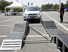 在25°的高橋障礙模擬試驗(yàn)中,為了塑造出近乎真實(shí)的惡劣環(huán)境,廠家在上坡過(guò)程中加入兩排滾軸從而模擬雪天爬坡的狀況。RAV4的主動(dòng)扭矩分配控制四輪驅(qū)動(dòng)系統(tǒng),通過(guò)對(duì)后輪最大扭矩的分配產(chǎn)生巨大的牽引力,使車(chē)輛平穩(wěn)攀爬至坡頂。