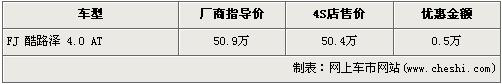 據(jù)廣州豐田4S店銷售人員表示,F(xiàn)J酷路澤已經(jīng)停止了進(jìn)口目前在售的都是庫存貨,目前FJ酷路澤有5000元的優(yōu)惠,前段時(shí)間的3萬元優(yōu)惠已不復(fù)存在。經(jīng)優(yōu)惠后,F(xiàn)J酷路澤的售價(jià)從原廠商指導(dǎo)價(jià)50.9萬元下降到了50.4萬元。銷售人員還介紹,目前FJ酷路澤現(xiàn)車不多,多處商家已無現(xiàn)車,其顏色主要以黃色居多,欲購買者應(yīng)快快出手。