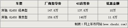 據(jù)經(jīng)銷商處銷售人員介紹,目前國內(nèi)在售的奔馳GL級(jí)分為GL450 經(jīng)典版與GL450 尊貴版,近日奔馳GL系的最高優(yōu)惠金額增到了11.8萬元。經(jīng)優(yōu)惠后,低配車型的經(jīng)典版售價(jià)降為了137.8萬元,跌破了140萬,高配的尊貴版經(jīng)全系最高的10萬元優(yōu)惠后,車型售價(jià)也降為了148萬元,首次跌破150萬元。