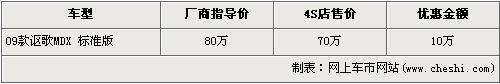 據(jù)經(jīng)銷商銷售人員介紹,09款謳歌-MDX的現(xiàn)金優(yōu)惠10萬元,優(yōu)惠后售價(jià)也從原廠商售價(jià)80萬降到了70萬。銷售人員還介紹,09款謳歌MDX增加的實(shí)用性的配件包括前下護(hù)板和后下護(hù)板,能避免惡劣路況對(duì)底盤帶來的損傷,并且09款謳歌MDX還新增了巴厘海藍(lán)和摩卡褐金兩種顏色,店內(nèi)現(xiàn)車非常充足,顏色也比較全,欲購買者挑選的空間非常大。