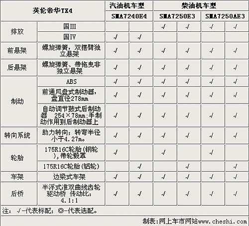 英倫TX4的柴油版只達(dá)到國Ⅲ的排放標(biāo)準(zhǔn),而汽油版車型卻達(dá)到了國Ⅳ排放標(biāo)準(zhǔn)。這款車型采用雙擺臂獨立前懸架,拖曳臂非獨立后懸架,制動系統(tǒng)采用前通風(fēng)盤式,后鼓式制動器。TX4采用175R16C的輪胎,不過低配車型卻只配備鋼輪轂。