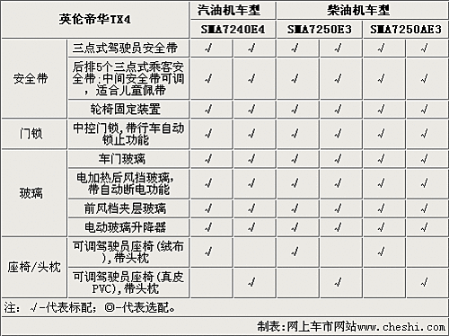 英倫TX4的后排帶有五個三點式安全帶,并且后排還帶有輪椅固定裝置。TX4配備了中控門鎖,帶行車自動鎖止功能,后風(fēng)擋玻璃也可以加熱,并且?guī)в凶詣訑嚯姽δ堋X4的高配車型都配備了真皮座椅,低配車型采用絨布材料座椅。