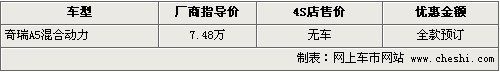 據(jù)4S店銷售人員介紹,奇瑞A5混合動力車型目前銷量很少,但仍有少量夠買者。消費者如果購車的話需要全款訂車,這款車的售價為7.48萬元。