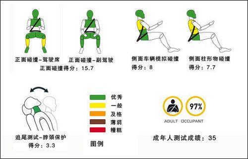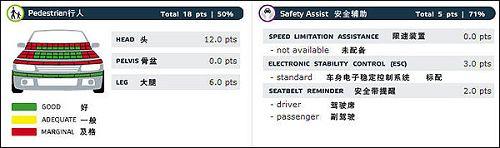 上圖描述的是車輛對(duì)于路人的保護(hù)情況和安全輔助設(shè)備配置情況。路人安全在歐洲已經(jīng)普遍重視,很多檢測項(xiàng)目已經(jīng)有了很清晰的標(biāo)準(zhǔn)。圖中看出,高爾夫6代翼子板部分對(duì)行人傷害是比較重的。在安全配置方面,高爾夫6代標(biāo)配了ESC,也就是我們國內(nèi)常說的ESP,不知道國產(chǎn)版本會(huì)不會(huì)“偷工減料”。駕駛席和副駕駛的安全帶提醒裝置都為高爾夫6代的最終成績做了加分。
