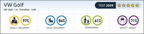 綜合來看,高爾夫6代獲歐洲碰撞測試實(shí)驗(yàn)室5星評(píng)價(jià)。對(duì)成員保護(hù)得分率97%,對(duì)兒童保護(hù)得分率84%,對(duì)行人保護(hù)得分率61%,安全輔助裝備得分率71%。