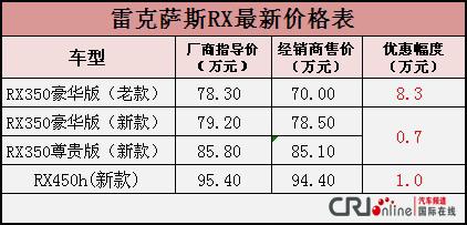 新款RX350分別為豪華版和尊貴版兩款車型,近期購(gòu)買RX350新款的消費(fèi)者可以得到7000元的優(yōu)惠。銷售人員還介紹,剛剛上市的RX450h車型貨源相對(duì)比較緊張,所以只有1萬(wàn)元的優(yōu)惠,而且目前還有老款RX350的庫(kù)存車,優(yōu)惠幅度較大,達(dá)到了8.3萬(wàn)元,售價(jià)達(dá)到70萬(wàn)元。詳細(xì)優(yōu)惠信息如下: