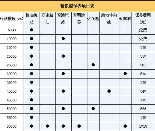 新凱越每次的保養(yǎng)間隔為5000km,首保免費(fèi)。保修政策為2年/6萬(wàn)公里保修(以先到為準(zhǔn))。為了方便計(jì)算,我們以一年行駛2萬(wàn)km為標(biāo)準(zhǔn),那么新凱越一年要做四次保養(yǎng)。由下表可知其一年保養(yǎng)費(fèi)用1400元。