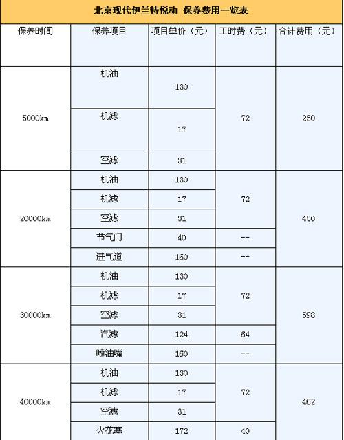 悅動(dòng)的首保為5000km,以后每次的保養(yǎng)間隔為5000km。保修政策為2年/6萬(wàn)公里保修(以先到為準(zhǔn))。第二次的10000km保養(yǎng)和首保內(nèi)容相同。那么如果一年行駛2萬(wàn)km,悅動(dòng)一年要做四次保養(yǎng)。由下表可知其除了第一年,以后每年的保養(yǎng)費(fèi)用1500元。