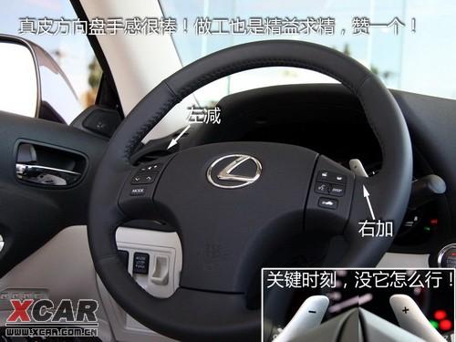 除了色調(diào)外,IS300C的內(nèi)部設(shè)計(jì)與普通車型基本上一致,不過我倒是覺得儀表盤IS300C完全可以再炫一些,“風(fēng)”要由內(nèi)而外的“拉”。IS系列的方向盤手感很棒,真皮材質(zhì)很細(xì)膩,粗細(xì)也非常趁手,普通車型都具備的換擋撥片當(dāng)然也不會缺席。