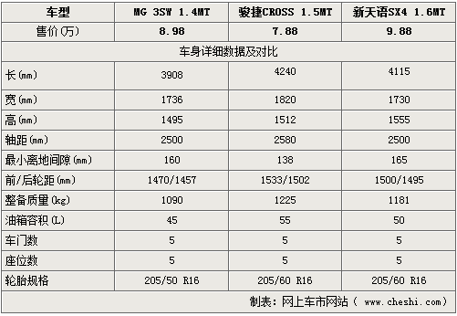 三款車的車體尺寸差距較明顯,不論外觀尺寸還是軸距均有所不同,駿捷的長/寬/高三項均明顯優(yōu)于名爵MG3與天語,而軸距方面也是駿捷CROSS更勝一籌,所以三車的內部空間相比起來自然是剛剛上市的駿捷CROSS更寬大一些。其它方面如輪轂輪胎尺寸則相差不多,三車輪胎寬度均符合跨界車的多面性要求。