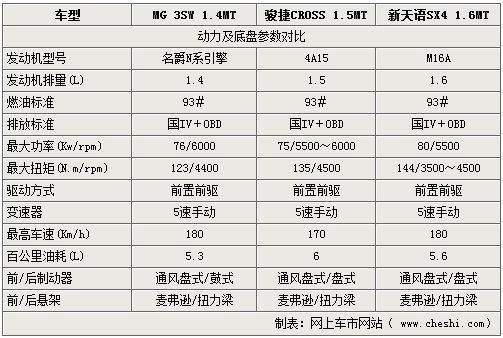 在動力方面,三款車型的排量分別為1.6L,1.5L以及1.4L,在排量不同的基礎上,天語以及名爵MG3在功率輸出方面表現(xiàn)更佳,而駿捷CROSS則在扭矩的輸出方面表現(xiàn)的較為突出。最高車速方面三車相差僅10公里/每小時,底盤的懸架設計也基本一致,但是駿捷CROSS的前后盤式制動顯然要優(yōu)于MG3的前盤后鼓的制動設計,而排量更高的天語則凸顯了日系車的油耗優(yōu)勢。