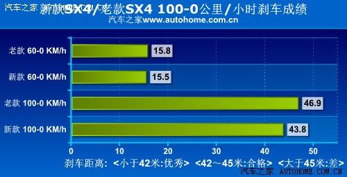 剎車(chē)部分大家關(guān)注的焦點(diǎn),畢竟換上了四輪盤(pán)剎,其成績(jī)應(yīng)該有所提升。經(jīng)過(guò)測(cè)試,SX4剎車(chē)成績(jī)?yōu)?3.8米,通過(guò)對(duì)比就可以發(fā)現(xiàn),這一成績(jī)比起使用鼓剎的老款車(chē)型的確有不小的提升。