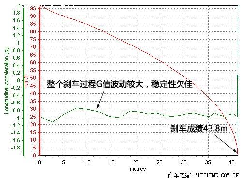 但43.8米的成績(jī)只處在我們認(rèn)為合格的范圍內(nèi),離優(yōu)秀尚有不小的距離。究其原因,我們阻礙剎車(chē)更好表現(xiàn)的因素和1.8L相同,即懸掛無(wú)法給予車(chē)身足夠的支撐,重心過(guò)度向前偏移使得后輪附著力下降,四輪盤(pán)式剎車(chē)的作用一下變小了很多。