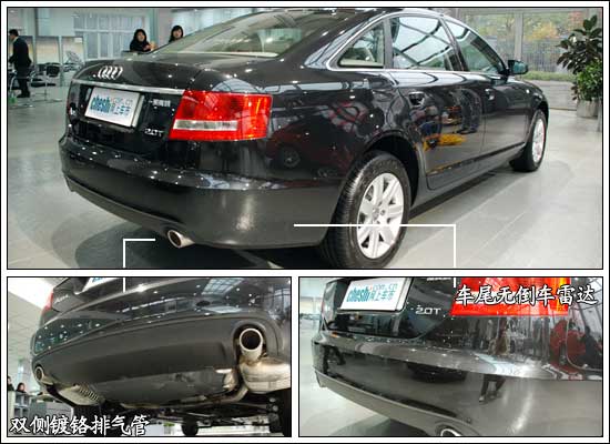 A6L尾部上方由圓潤(rùn)的流線型改為略微翹起的棱角,具有擾流板的功效,同時(shí)也使尾部造型更顯硬朗和運(yùn)動(dòng)化。在車尾部分“公務(wù)版”A6L的特征在于取消了倒車?yán)走_(dá),但整體造型上左右雙出式的鍍鉻排氣管依然很有氣勢(shì)!