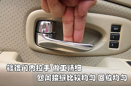 車門內(nèi)側(cè)拉手采用鍍鉻設(shè)計,金屬感比較強烈。雖然拉手周圍由塑料制成,但是拉手周圍的做工都很精細。
