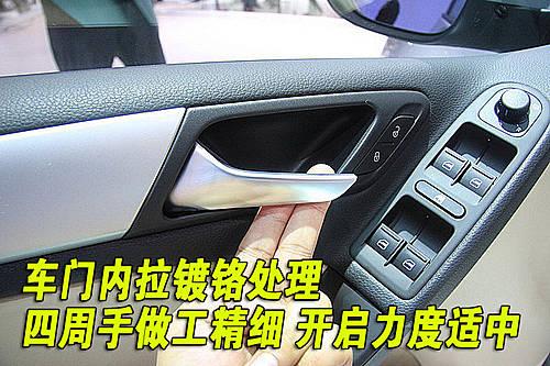 第六代高爾夫四只車門拉手都噴上了與車身同色的車漆,開(kāi)啟車門時(shí)發(fā)現(xiàn)車門拉手部分做工比較細(xì)致。