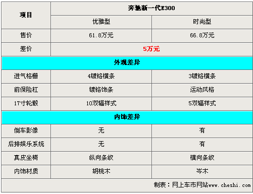 奔馳新E300優(yōu)雅型和時(shí)尚型5萬(wàn)元的差價(jià),主要體現(xiàn)在外觀和內(nèi)飾等配置上。奔馳新E300時(shí)尚型標(biāo)配的倒車影像、17寸5雙輻合金輪轂、橫向條紋座椅、岑木內(nèi)飾以及后排娛樂(lè)系統(tǒng)均沒有出現(xiàn)在奔馳新E300優(yōu)雅型上。