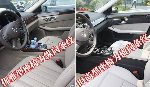 奔馳新E300優(yōu)雅型和時(shí)尚型除內(nèi)飾條材質(zhì)差異外,全車(chē)真皮坐椅的剪裁也略有差異。奔馳新E300優(yōu)雅型作為入門(mén)級(jí)車(chē)型,全車(chē)真皮坐椅采用縱向條紋設(shè)計(jì),而奔馳新E300時(shí)尚型則采用橫向條紋設(shè)計(jì)。