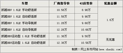 據(jù)經(jīng)銷商處銷售人員介紹,別克凱越HRV已經(jīng)停產(chǎn),店內(nèi)在售的車型只有舒適版和導(dǎo)航版,運(yùn)動版車型已經(jīng)沒有庫存車。在售的舒適版和導(dǎo)航版車型優(yōu)惠1.6萬元,全系入門級的手動舒適版售價(jià)降到了8.98萬元。