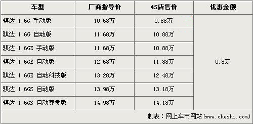 據(jù)東風(fēng)日產(chǎn)4s店銷售人員介紹,目前東風(fēng)日產(chǎn)騏達(dá)全系優(yōu)惠9000元。經(jīng)優(yōu)惠后,入門級(jí)的1.6G手動(dòng)版售價(jià)下降到了9.88萬(wàn)元,而全系最高配的1.6 GS自動(dòng)尊貴版售價(jià)也降到了14.18萬(wàn)元。銷售人員還介紹,目前店內(nèi)沒(méi)有騏達(dá)現(xiàn)車,欲購(gòu)買者需交2000元訂金約等1個(gè)月時(shí)間。