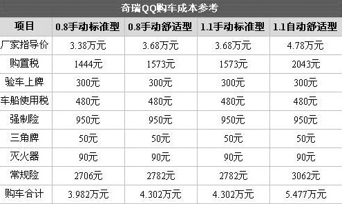 一、購車成本,奇瑞QQ的0.8手動(dòng)標(biāo)準(zhǔn)低廉的價(jià)格,非常適合資金不足的消費(fèi)者,夠用的配置,較好的油耗能夠滿足眾多用戶的需要。1.1手動(dòng)標(biāo)準(zhǔn)版合理的價(jià)位,較高的配置,更適合大眾群體選購。