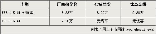 據(jù)比亞迪汽車北京地區(qū)4S店銷售人員介紹,目前北京在售的比亞迪F3R只有1.5L手動舒適版車型,并且廠商指導(dǎo)價也從6.08萬元回升到了6.28萬元。目前購買此車的消費者可以得到2800元的優(yōu)惠,經(jīng)優(yōu)惠后售價降到了6萬元。