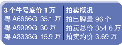 這次競(jìng)拍會(huì)上最受矚目的無(wú)疑是粵A3333G、粵A6666G、粵A9999G三個(gè)底價(jià)1萬(wàn)的四連號(hào)。最后,550號(hào)競(jìng)拍者以35.1萬(wàn)高價(jià)競(jìng)拍粵A6666G成功,成為本場(chǎng)“標(biāo)王”。而上期標(biāo)王粵A6666G僅拍出16萬(wàn)元。(記者譚德波)
