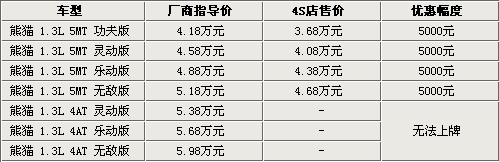 據(jù)吉利汽車4S店銷售人員介紹,熊貓1.3L手動擋車型目前都有現(xiàn)車銷售,而自動擋雖然已經(jīng)上市,但由于北京地區(qū)無法上牌,所以還沒有現(xiàn)車抵達(dá)北京市場,預(yù)計(jì)最早會在今年8月份解決無法上牌的問題。目前熊貓1.3L手動擋全系可以優(yōu)惠五千元,而這款車型還增加了電動升級后窗,需要在原價的基礎(chǔ)上加1000元。