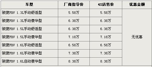 駿捷FRV是中華汽車首款兩廂車型,排量分為1.6L和1.3L,兩種排量車型分別在去年5月份和7月份上市。近期,駿捷FRV的車型再次得到了豐富,1.5L車型已經(jīng)進(jìn)入各家中華經(jīng)銷店并開(kāi)始售賣,駿捷FRV全系的售價(jià)區(qū)間為5.58萬(wàn)元-8.38萬(wàn)元。根據(jù)我們價(jià)格系統(tǒng)監(jiān)測(cè)顯示,駿捷FRV全系取消了現(xiàn)金優(yōu)惠,具體詳情請(qǐng)看下表: