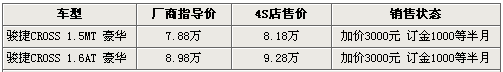 上市不久的全新跨界車型駿捷CROSS,是華晨旗下較重視的主力車型之一。駿捷CROSS共有兩款車型,分別搭載1.5L、1.6L兩款引擎,售價(jià)7.88-8.98萬(wàn)元。網(wǎng)站由華晨經(jīng)銷商處了解到,駿捷CROSS展車已經(jīng)到店,購(gòu)車需要加價(jià)3000元,現(xiàn)階段全系車型仍需預(yù)訂購(gòu)買,訂金1000元。具體詳情如下: