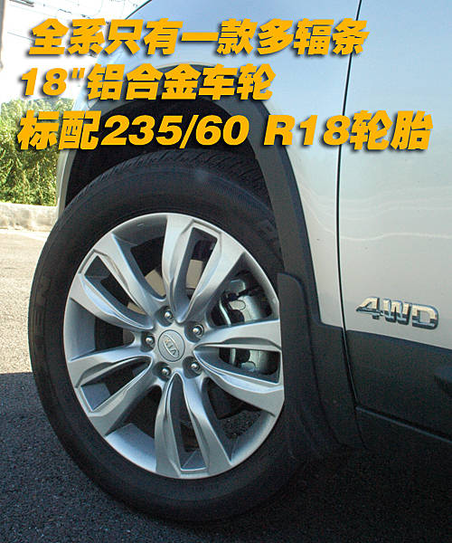 全新索蘭托配備了尺寸為235/60 R18輪胎。外觀輪轂采用了多幅輪轂,外觀切割的輪轂線條剛勁有力,運(yùn)動(dòng)風(fēng)格非常強(qiáng)。在輪轂方面沒有選擇型,所以車型只有一款樣式。