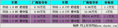海馬歡動1.6L共有三款車型,其中基本型由于配置低,市場上并沒有銷售,而海馬也不會為這樣一款低配車型匹配CVT變速箱,所以,歡動1.6L CVT可能只有舒適型和豪華型兩款車。從歡動1.8L的手動擋和自動擋的差價(jià)可以看到,舒適型相差1.1萬元,而豪華型也相差1萬元。依照海馬歡動的定價(jià)規(guī)則,歡動1.6L CVT舒適型和豪華型的價(jià)格預(yù)計(jì)為9.46萬元和10.26萬元。