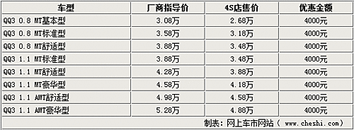 據(jù)奇瑞QQ3專營店銷售人員介紹,奇瑞QQ3系列車型比較齊全,只有1.1AMT車型現(xiàn)車較少。但目前QQ3全系都有一定的優(yōu)惠幅度,除現(xiàn)車較少的車型需要提前預(yù)訂以外,全系車型均可以優(yōu)惠4000元。