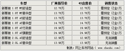 經(jīng)銷商透露,現(xiàn)在各店內(nèi)的新尊馳基本為展車或已被客戶預(yù)訂的車輛,基本沒(méi)有現(xiàn)車可以滿足消費(fèi)者的需要,消費(fèi)者如需購(gòu)買(mǎi)可以繳納1萬(wàn)元訂金后等待20天左右即可提車。由于新尊馳為剛剛上市的新車,所以沒(méi)有任何形式的優(yōu)惠。同時(shí)銷售人員還說(shuō)明,2.0L的新尊馳由于尚未大量投產(chǎn),故暫時(shí)無(wú)法銷售,請(qǐng)消費(fèi)者諒解。