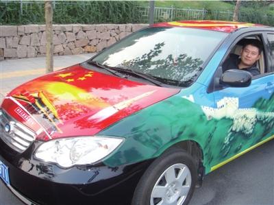“前機(jī)蓋是巨幅的天安門城樓,車身兩側(cè)是鳥巢和長(zhǎng)城,在車的頂上,則是60年大慶的圖標(biāo)!睘橄驀鴳c獻(xiàn)禮,家住天安門附近的林先生和朋友一起在自己的愛車上做了一系列的彩繪,表達(dá)對(duì)祖國的祝福。