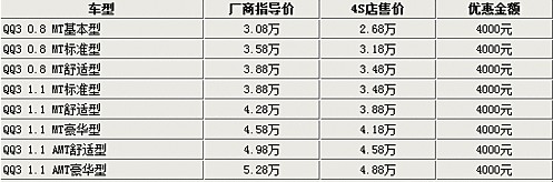 據(jù)奇瑞QQ3專營(yíng)店銷售人員介紹,奇瑞QQ3系列車型比較齊全,只有1.1AMT車型現(xiàn)車較少。但目前QQ3全系都有一定的優(yōu)惠幅度,除現(xiàn)車較少的車型需要提前預(yù)訂以外,全系車型均可以優(yōu)惠4000元。