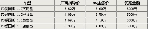 據(jù)比亞迪汽車4S店銷售人員介紹,比亞迪F0愛國版igo系列車型的現(xiàn)車并不是很齊全,實用型和舒適型都有現(xiàn)車,尊貴型和旗艦型則需要預(yù)訂,大概10-15天即可提車。而目前1.0L實用型和舒適型都有現(xiàn)車,其中實用型可以優(yōu)惠6000元,優(yōu)惠后售價已經(jīng)接近3萬;而其他車型只可以優(yōu)惠5000元現(xiàn)金。