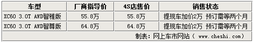 據(jù)沃爾沃汽車4S店銷售人員介紹,XC60目前僅有少量現(xiàn)車到店,但顏色并不齊全。由于目前沃爾沃XC60的現(xiàn)車比較緊張,現(xiàn)在購(gòu)車仍然需要預(yù)訂,兩個(gè)月左右便可以提車,如果消費(fèi)者想要店內(nèi)購(gòu)買提車的話,需要加價(jià)2萬(wàn)元。
