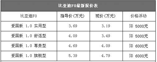 新奧拓16日上市之后熱銷,部分地區(qū)甚至出現(xiàn)了加價售車的情況,作為新奧拓最有直接的競爭對手,比亞迪F0近期的價格有沒有變化呢?昨日,我們從北京地區(qū)的部分綜合經(jīng)銷商處了解到,近期比亞迪F0最高可優(yōu)惠6000元,其最低配車型愛國版1.0手動實用型的售價已經(jīng)降至3.19萬元,比QQ3 1.1L排量還要便宜,是國內(nèi)1.0L以上排量中最便宜的新車,性價比出眾。以下是比亞迪F0最新報價表: