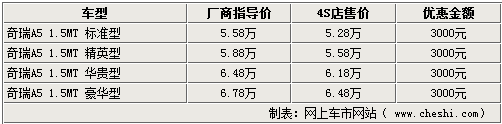 據(jù)奇瑞4S店銷售人員介紹,目前各點(diǎn)內(nèi)均主要銷售1.5升的A5車型,老款的A516已經(jīng)停產(chǎn),4S店都已經(jīng)沒有庫存車銷售,未來也不會再投產(chǎn)進(jìn)行銷售。目前奇瑞A515精英型等車型在店里都有現(xiàn)車銷售,為迎接國慶以及中秋雙節(jié)的來臨,現(xiàn)在購A5全系均可享受3000元的優(yōu)惠。