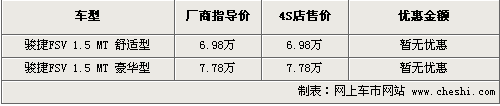 經(jīng)銷商透露,現(xiàn)在各店內(nèi)的FSV基本可滿足消費者的購車要求,車型及顏色也較為齊全,不再需要預訂購買。問及車型的優(yōu)惠,銷售人員表示,由于駿捷FSV為剛剛上市的新車,所以店內(nèi)暫時沒有任何形式的優(yōu)惠,還請消費者諒解。