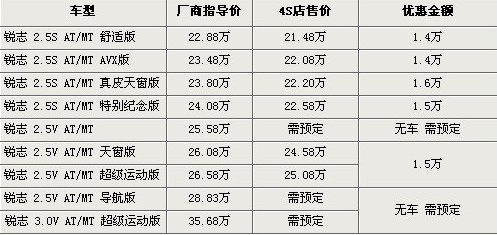 目前銳志全系車型最高優(yōu)惠可到1.6萬(wàn)元。目前優(yōu)惠后的最低售價(jià)僅為21.48萬(wàn)元,其中現(xiàn)車主要是2.5S版車型,2.5V部分車型需要預(yù)訂,訂金需要交納5000元。最快11月才能提車。