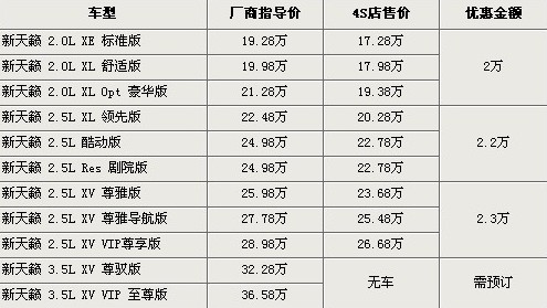 據(jù)東風日產(chǎn)經(jīng)銷店銷售人員介紹,目前新天籟(報價 參數(shù) 圖片 論壇)2.0舒適版和2.5領先版等比較受歡迎的車型有現(xiàn)車供應,主要為銀色/灰色等外觀。其他尊雅版車型需要預訂。目前的優(yōu)惠幅度為2萬元-2.3萬元不等,入門車型優(yōu)惠后僅售17.28萬元,對消費者而言性價比比較強。