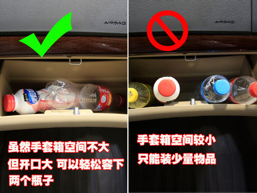 手套箱空間的確較小,雖然開(kāi)口角度大,但空間不能令人滿意。只能放下2個(gè)600mm的飲料瓶,這一點(diǎn)新景程有些令人失望。