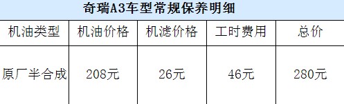 或許有人會想,采用自主研發(fā)發(fā)動機的奇瑞A3車型的保養(yǎng)費用上應(yīng)該比較便宜吧!其實不然,由于奇瑞4S店為奇瑞A3車型標(biāo)配的是美孚速霸1000半合成機油,因此材料費比較高,計算下來更換機油機濾總共需要花280元左右。而奇瑞A3享受兩次的免費保養(yǎng)檢測,第一次為2000公里時的免費檢測以及油液補充,第二次是5000公里的機油機濾的更換。