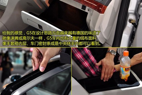 雖然總體感覺還不錯,但真正讓我們徹底認可瑞麒G5做工的還是一些細節(jié)方面的表現(xiàn)。首次前車門門板下端的絨面裝飾比較細膩,雖然它并沒有太多實際作用,但其意義所在就是用來提升車型的檔次感。同樣我們發(fā)現(xiàn)瑞麒G5在手套箱、中央扶手箱內(nèi)部都鋪墊了絨面內(nèi)襯,手感很有親和力。此外車門上的雙層密封絨布條也讓我們感到有些意外,這讓我們想到以做工精致著稱的大眾速騰。
