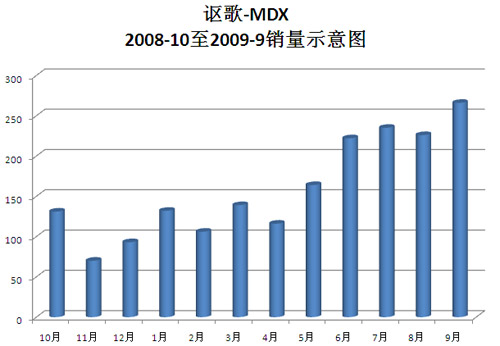 謳歌MDX是繼謳歌TL和RL兩款轎車引入國(guó)內(nèi)之后的第三款車型,謳歌MDX投放國(guó)內(nèi)市場(chǎng)后,一改謳歌TL和RL轎車平淡的銷量表現(xiàn)。通過(guò)上表近一年的銷量可以看出,謳歌MDX單月最高銷量已經(jīng)超過(guò)250臺(tái),并且表現(xiàn)強(qiáng)勁的上升態(tài)勢(shì)。
